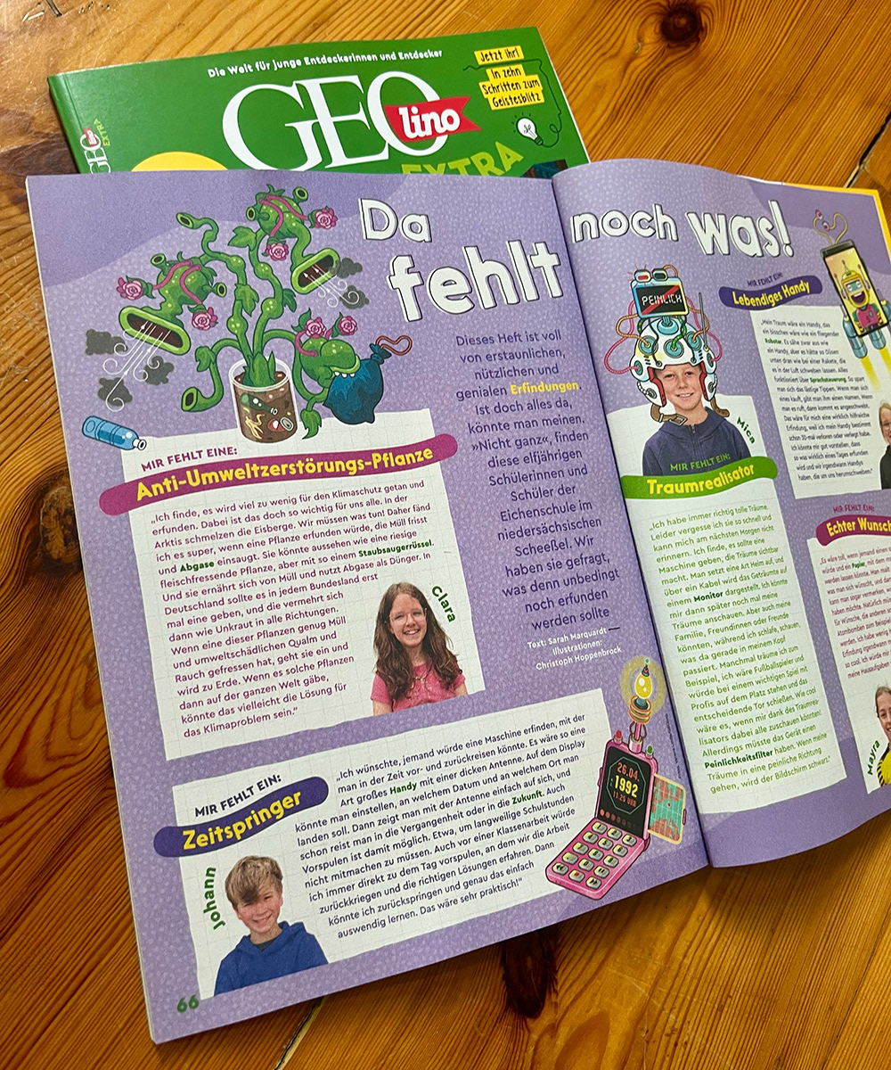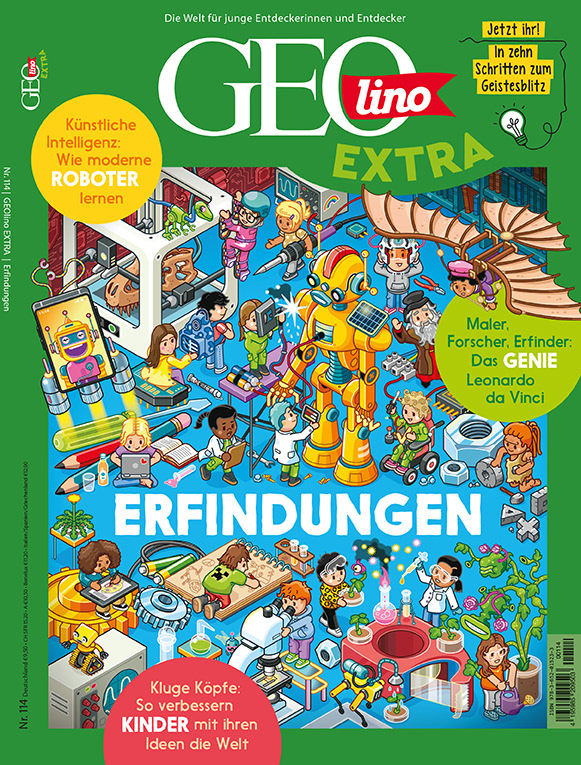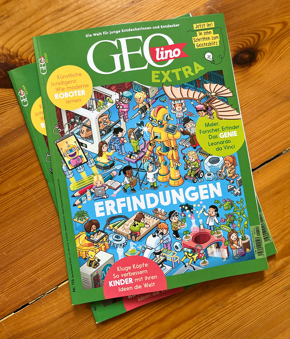 Cover Illustration für das Kinder-Magazin "GEOLINO EXTRA", Ausgabe 114. Das Thema sind "Erfindungen". Im Wimmelbild finden sich Stories aus dem Innenteil wieder. Cover Illustration for kids' science magazine "GEOLINO EXTRA"., edition 114. Topic is "Inventions".