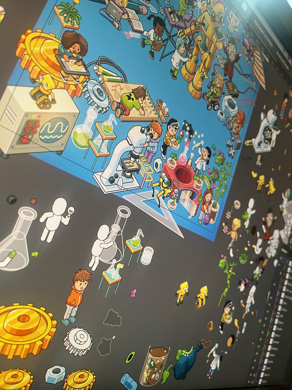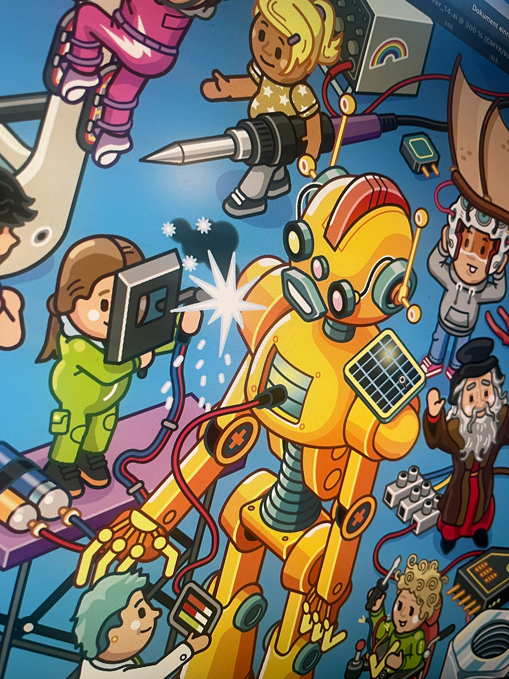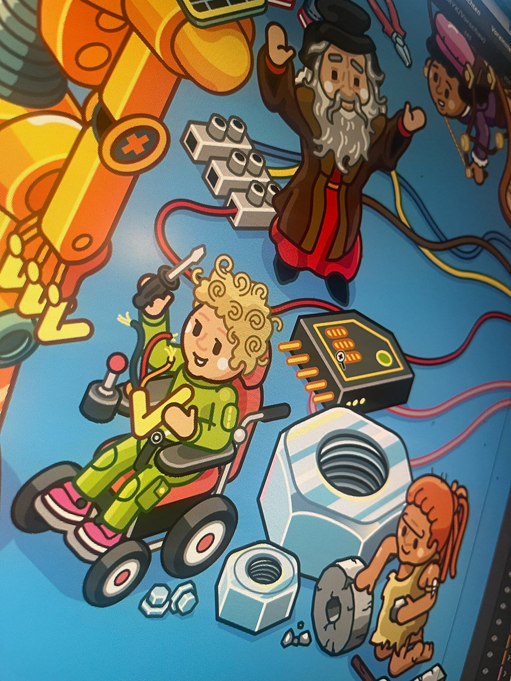 Cover Illustration für das Kinder-Magazin "GEOLINO EXTRA", Ausgabe 114. Das Thema sind "Erfindungen". Im Wimmelbild finden sich Stories aus dem Innenteil wieder. Cover Illustration for kids' science magazine "GEOLINO EXTRA"., edition 114. Topic is "Inventions".