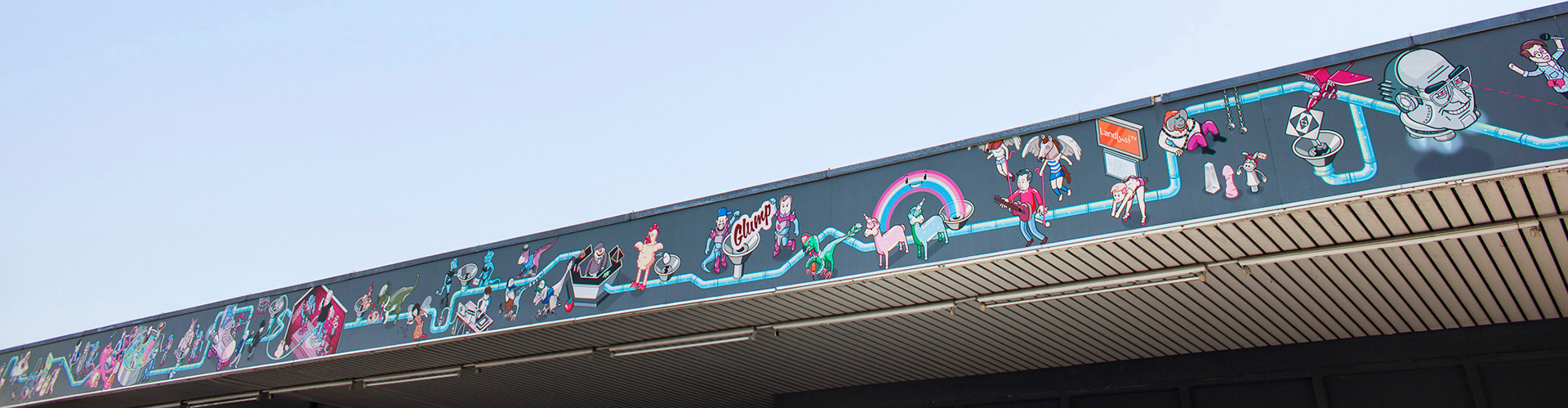 NEO MAGAZIN ROYALE with Jan Böhmermann is produced in "Studio König" (a former carpet factory in Cologne) by Bildundtonfabrik (btf). Studio König's appearance was in urgent need of some illustrational makeover. (Photos: Frederike Wetzels, btf, Nora Nagel and @mluenich on instagram, Thomas Schäkel) Logodesign by Florian Köhne (btf).
