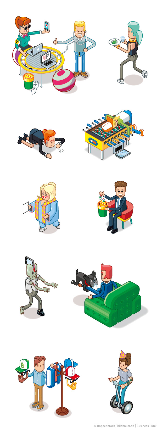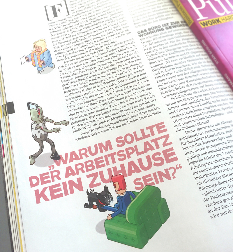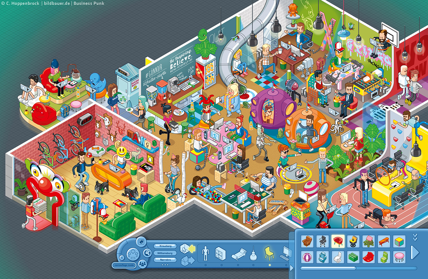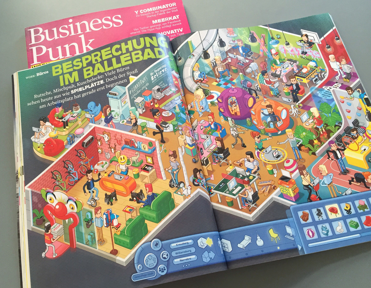 I made this wimmelbild-style editorial illustration for german magazine "Business Punk". The article is about why there is such generic furniture in hip modern offices and what it is hiding.