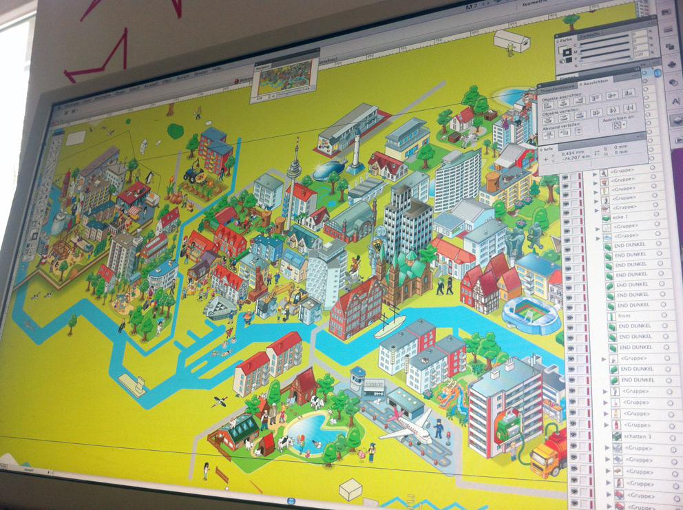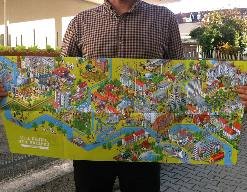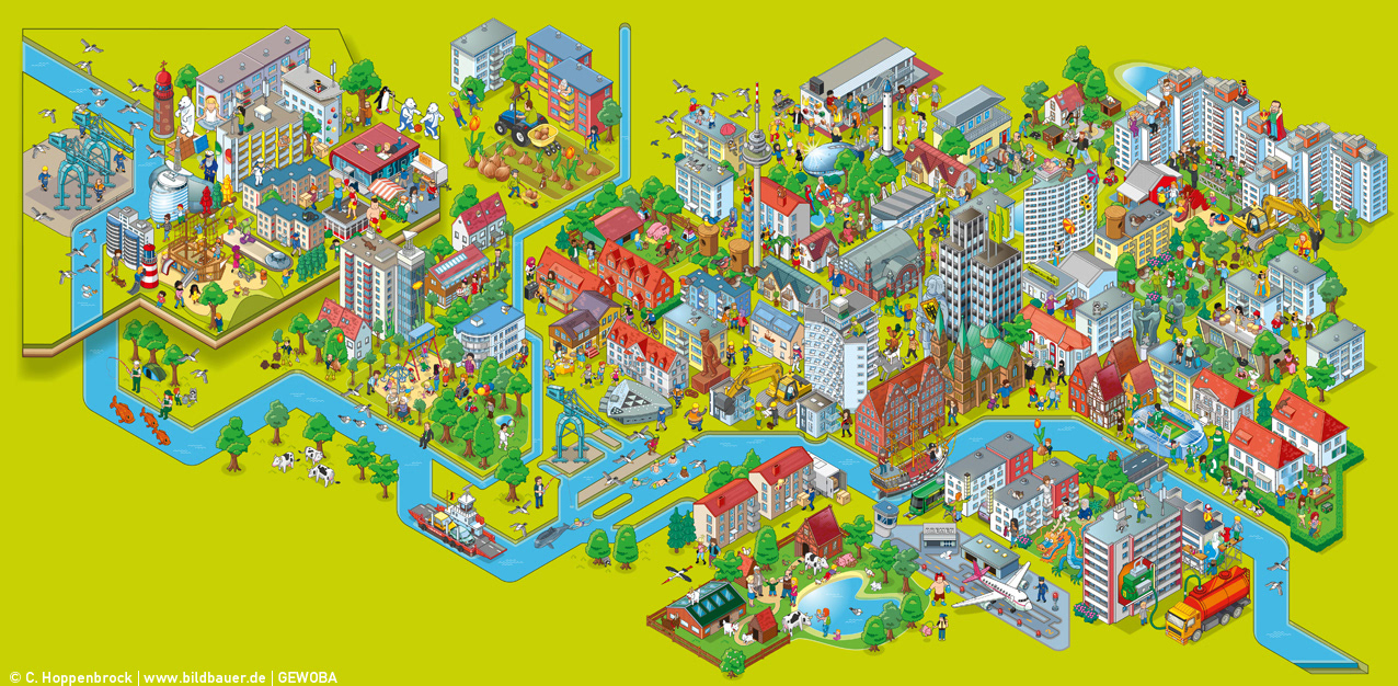 I was commissioned by german advertisers "Polarwerk" to illustrate a massive urban landscape as a campaign motive for their client GEWOBA, a housing society in Bremen, Germany, that turned 90 years. Luckily the image was liked so much they put it on a tram wich is still running in Bremen until today. Also, my drawing arm is still hurting from this job until today. ;) Please have a look at the whole image and close-ups at GEWOBA's website: http://www.gewoba.de/wimmelbild/gewoba-90jahre.html